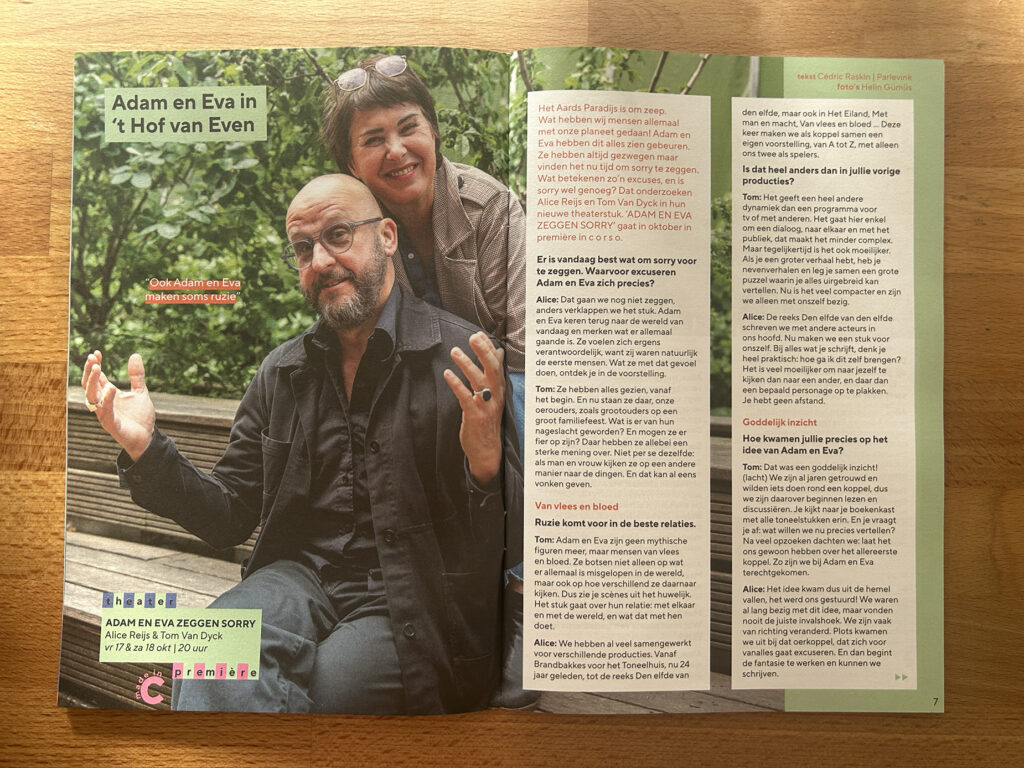 En die Tom Van Dyck, daar mocht ik zo’n dikke 30 jaar later mee rond de tafel zitten. Samen met zijn vrouw Alice Reijs. Voor het eerst maken de twee samen een stuk: ‘Adam en Eva zeggen sorry’. Het concept: de oervader en oermoeder hebben alles op aarde zien gebeuren en willen zich daar nu voor excuseren.