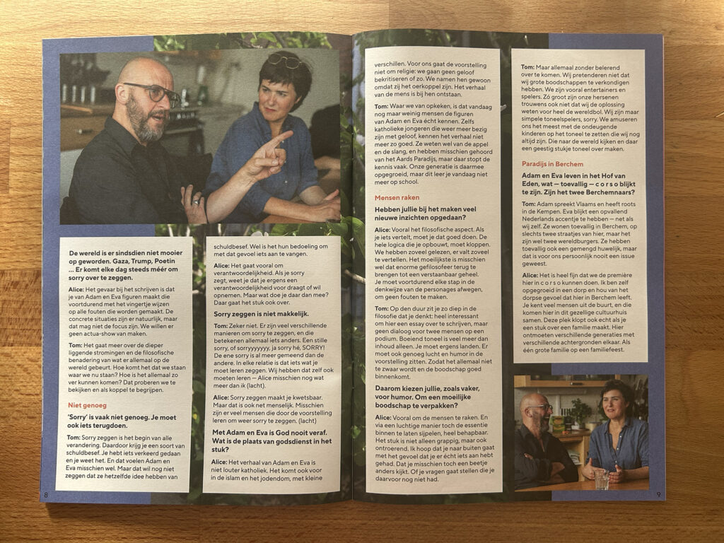 Heerlijk uitgangspunt voor een mooi interview. Spontaan schoten mij allerlei vragen te binnen. Hoe zien ze de evolutie van vijgenblad tot Chanel, van hun eco-moestuin tot klimaatopwarming, van Kain en Abel tot Poetin en Trump? Welke thema’s raken hen persoonlijk, wat leverde het onderzoek hen al op, wat betekenen Adam en Eva vandaag, en waar komen ze eigenlijk sorry voor zeggen?